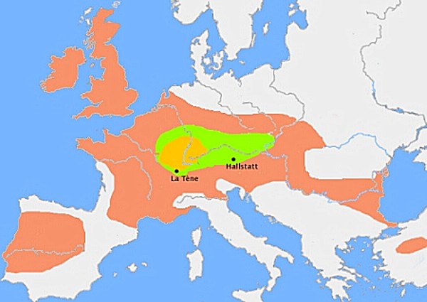 | Em verde a disseminação inicial da Cultura de Hallstatt. Em amarelo o núcleo inicial da Cultura de La Tène. Em Vermelho a extensão máxima do território dos povos celtas no século III a.C. |